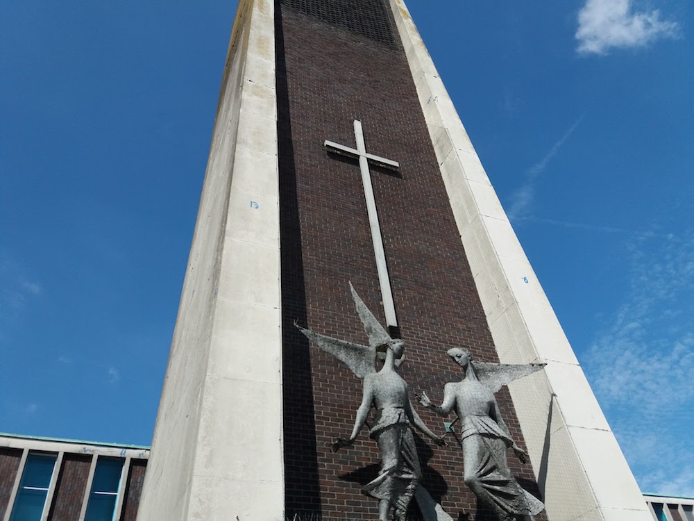 The angels are made of polyester resin and fibre glass sculpted by Wilfred Dudeney, head of Arts, Crafts and Liberal Studies at Isleworth Polytechnic in 1963.